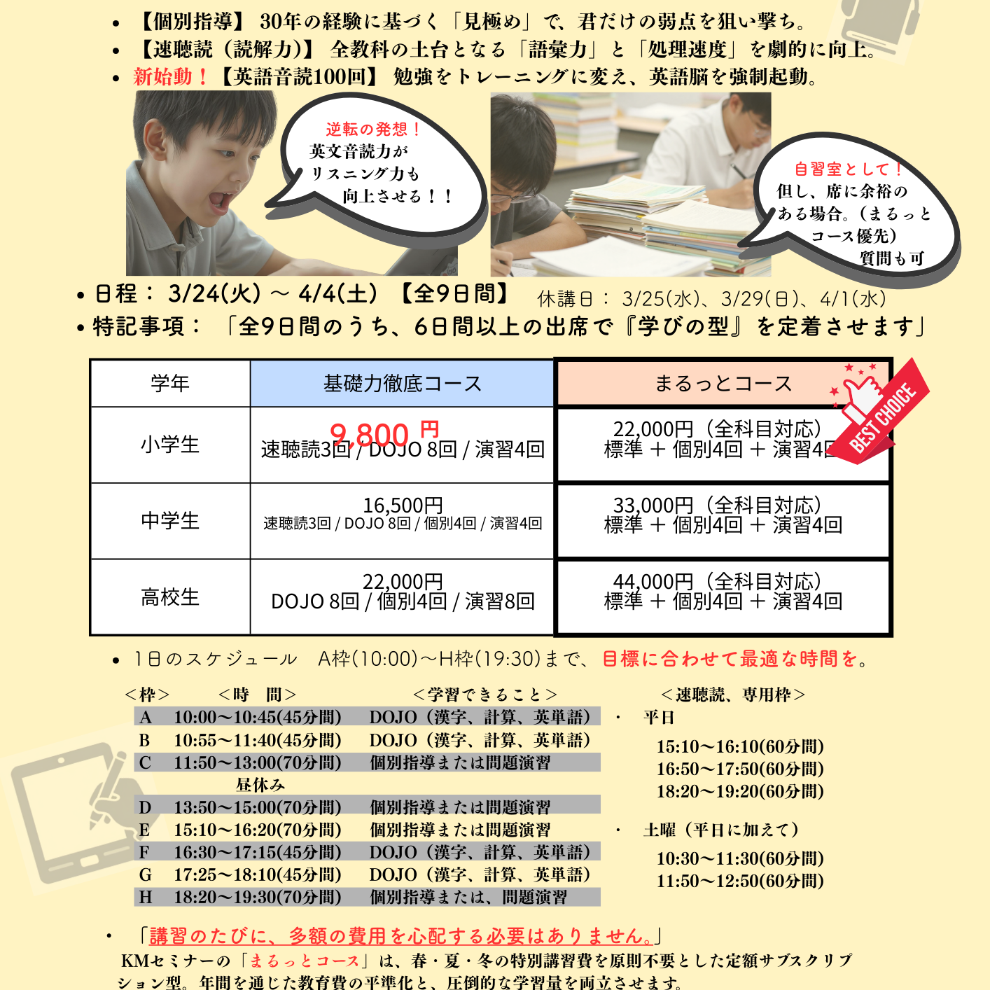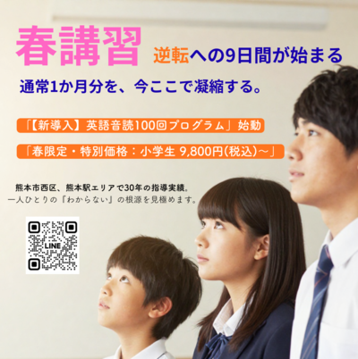 熊本駅前のKMセミナーです。30年の指導実績に基づき、一人ひとりの「わからない」の根源を見極める春期講習を開催いたします。